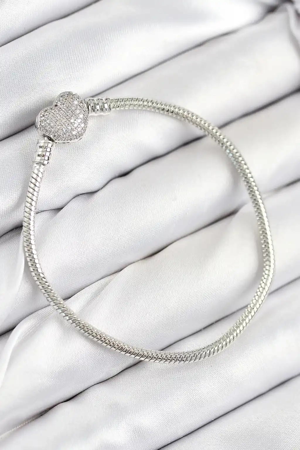 Pirinç Charm Zirkon Taşlı Kalp Model Gümüş Renk Kadın Bileklik