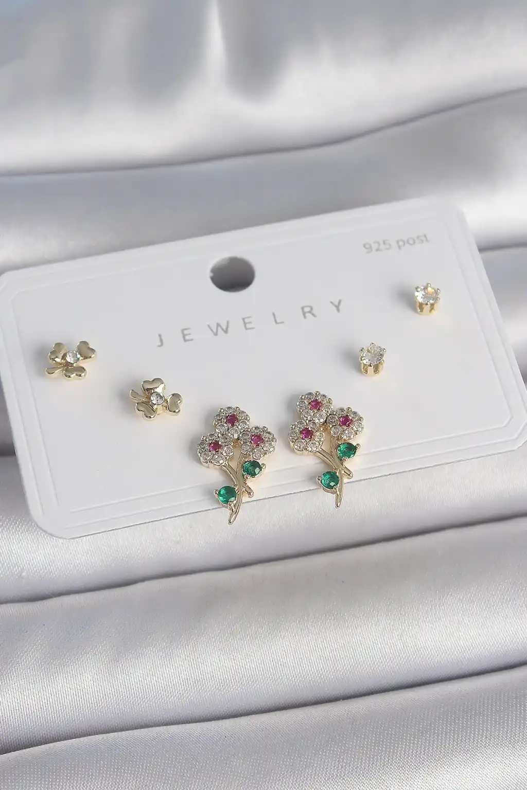 Pirinç Gold Renk Renkli Zirkon Taşlı Çiçek Model Yaprak Detay 925 Ayar Gümüş Çivi Kadın Küpe Seti