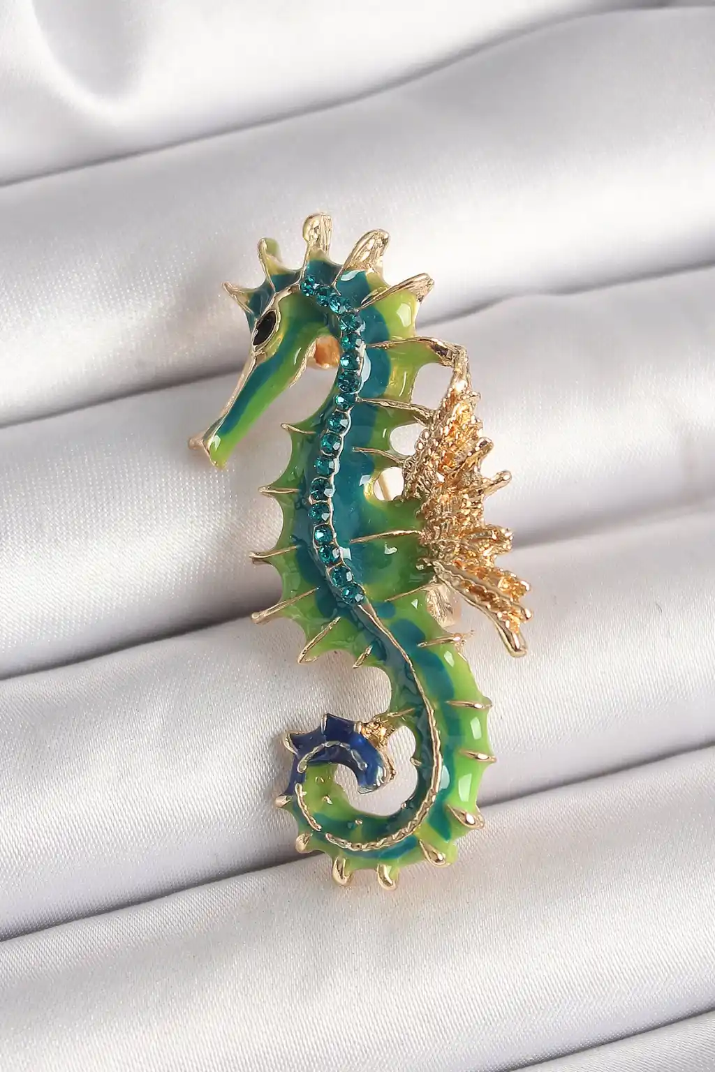 Pirinç Gold Renk Yeşil Deniz Atı Model Zirkon Taş Detay Kadın Broş