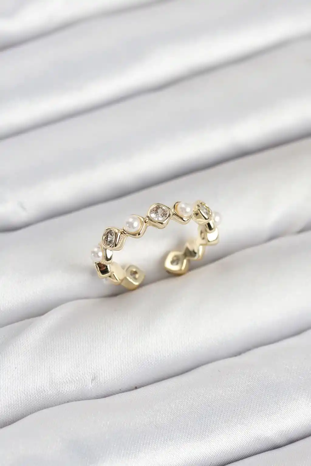 Pirinç Gold Renk Zirkon Taşlı İncili Kadın Yüzük