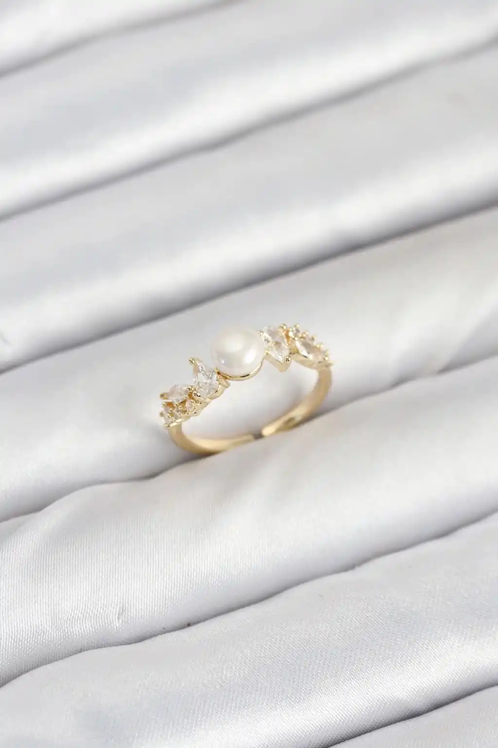Pirinç Gold Renk Zirkon Taşlı İncili Model Kadın Yüzük