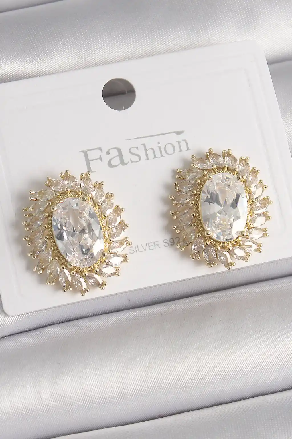 Pirinç Gold Renk Zirkon Taşlı Kadın Küpe