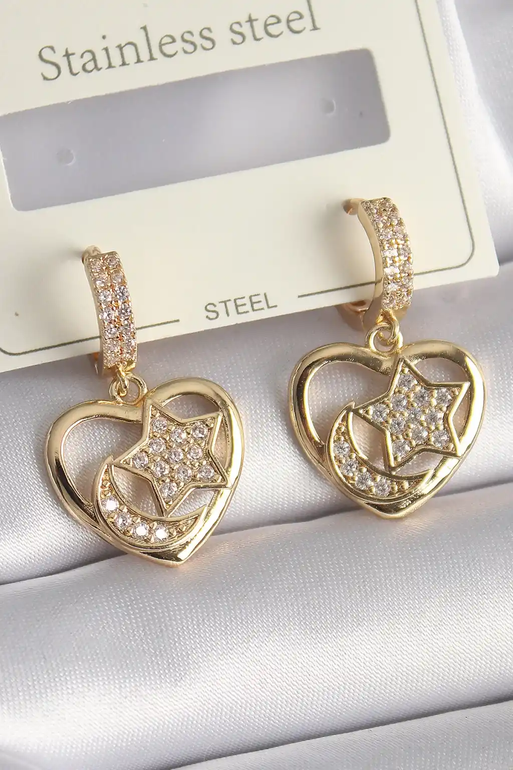 Pirinç Gold Renk Zirkon Taşlı Kalp Model Ay Yıldız İşleme Kadın Küpe