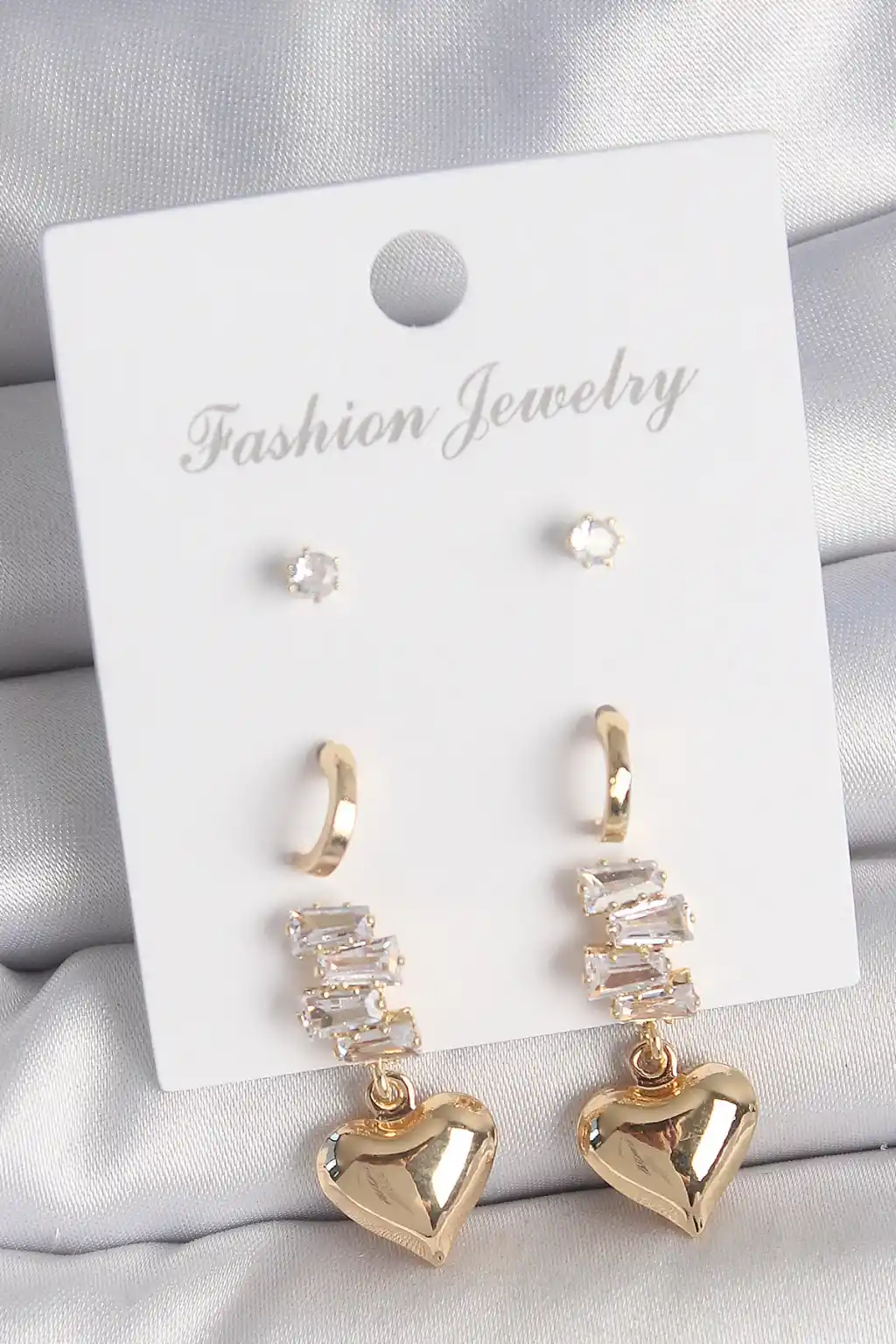 Pirinç Gold Renk Zirkon Taşlı Sallantılı Kalp Model Yarım Halka Detay 3 Çift Kadın Küpe Seti