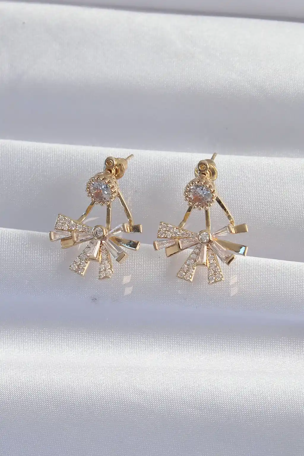 Pirinç Gold Renk Zirkon Taşlı Yassı Fiyonk Model Küpe