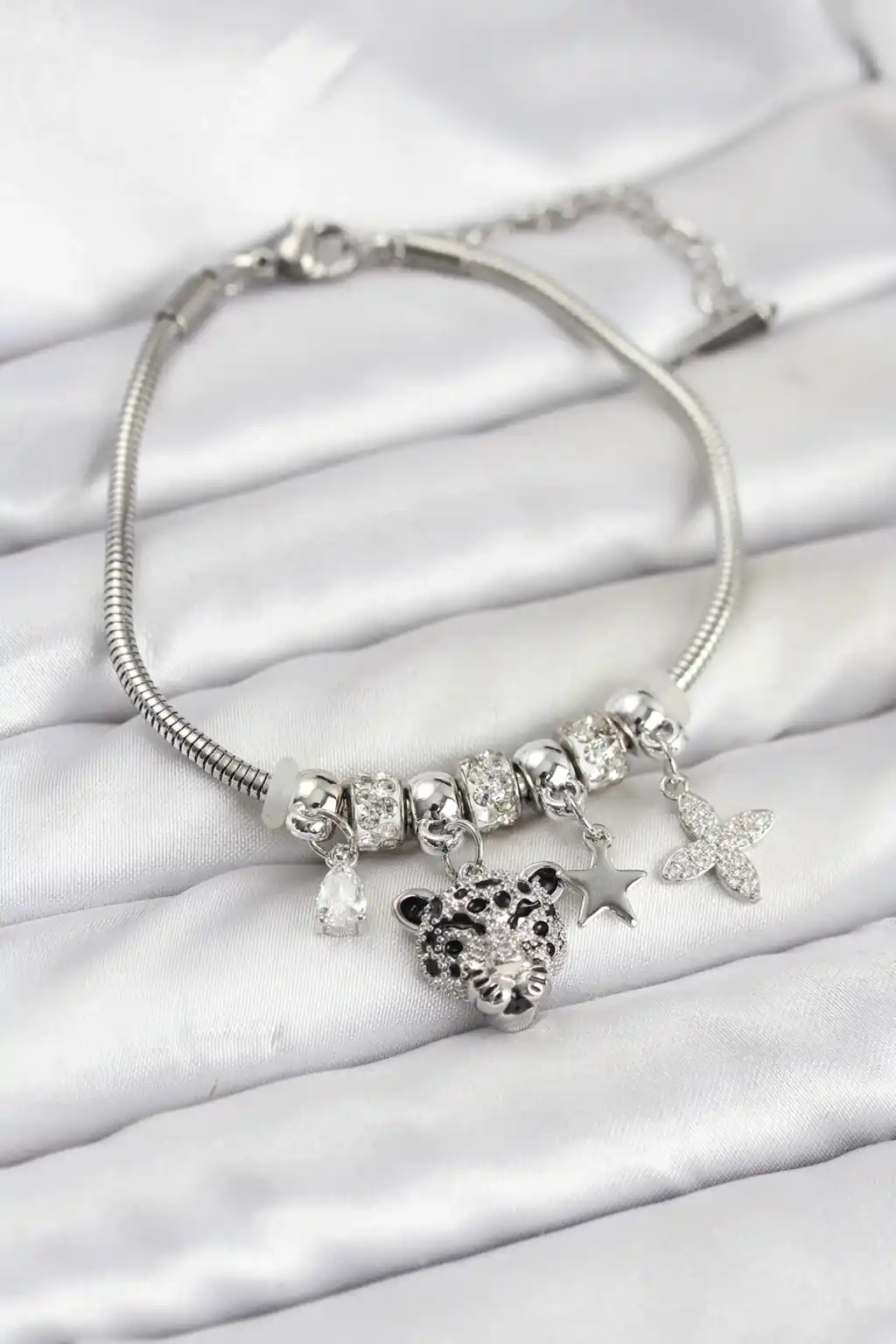 Pirinç Gümüş Renk Kaplan Model Charmlı Kadın Bileklik