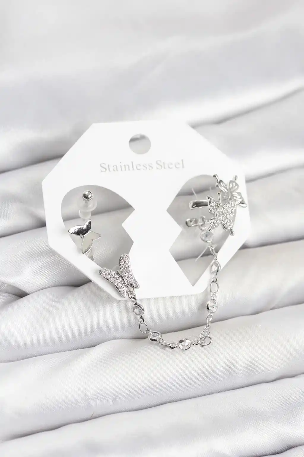 Pirinç Gümüş Renk Kelebek Model Zincir Bağlantılı Ear Cuff Küpe Seti