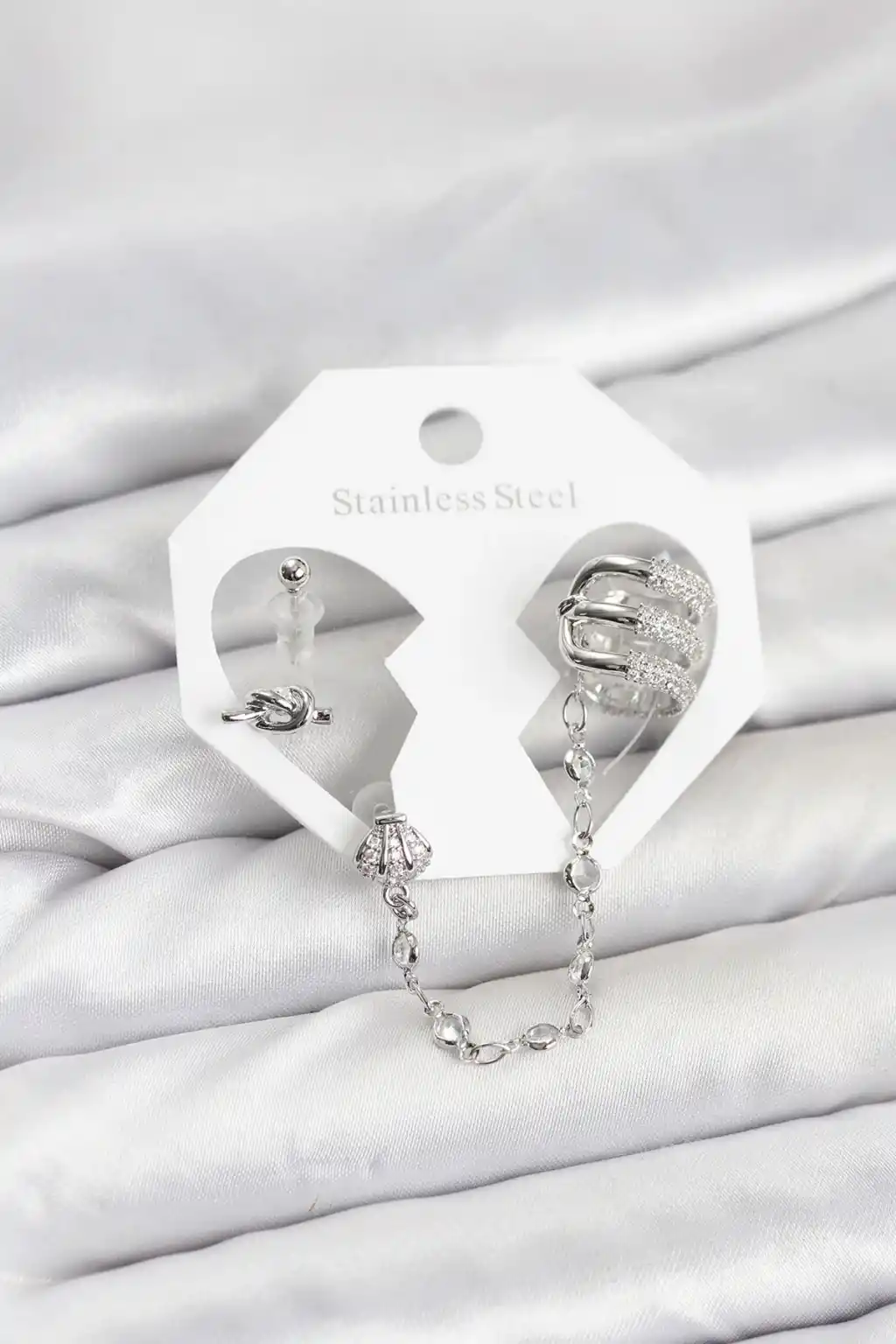 Pirinç Gümüş Renk Sarmal Model Zincir Bağlantılı Ear Cuff Küpe Seti