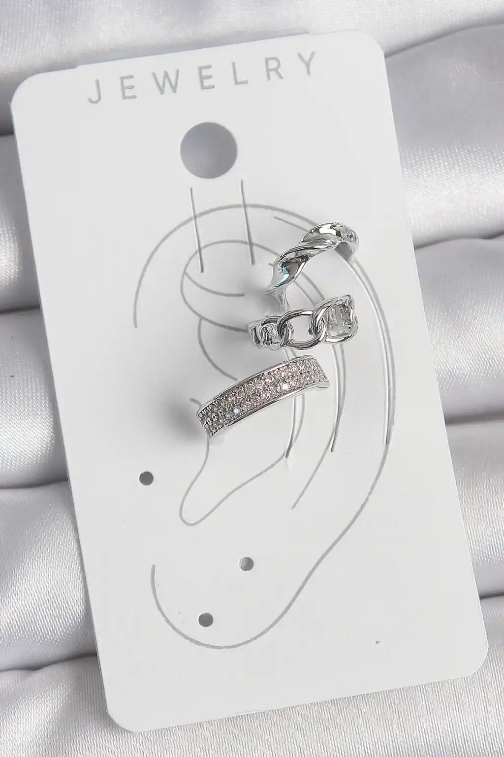 Pirinç Gümüş Renk Zirkon Taşlı 3'Lü Zincir Sarmal Model Kadın Kıkırdak Küpe