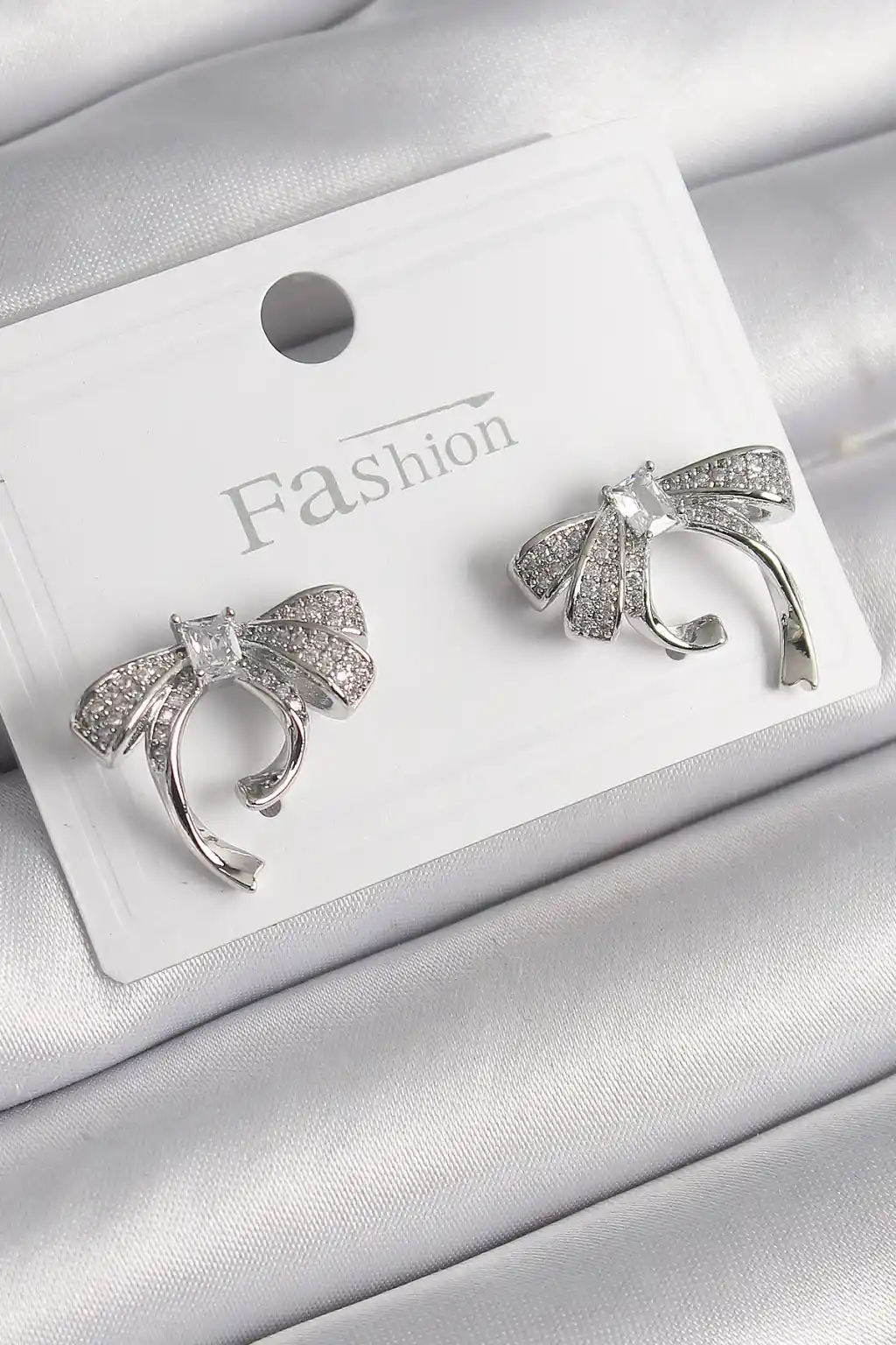 Pirinç Gümüş Renk Zirkon Taşlı Fiyonk Model Kadın Küpe