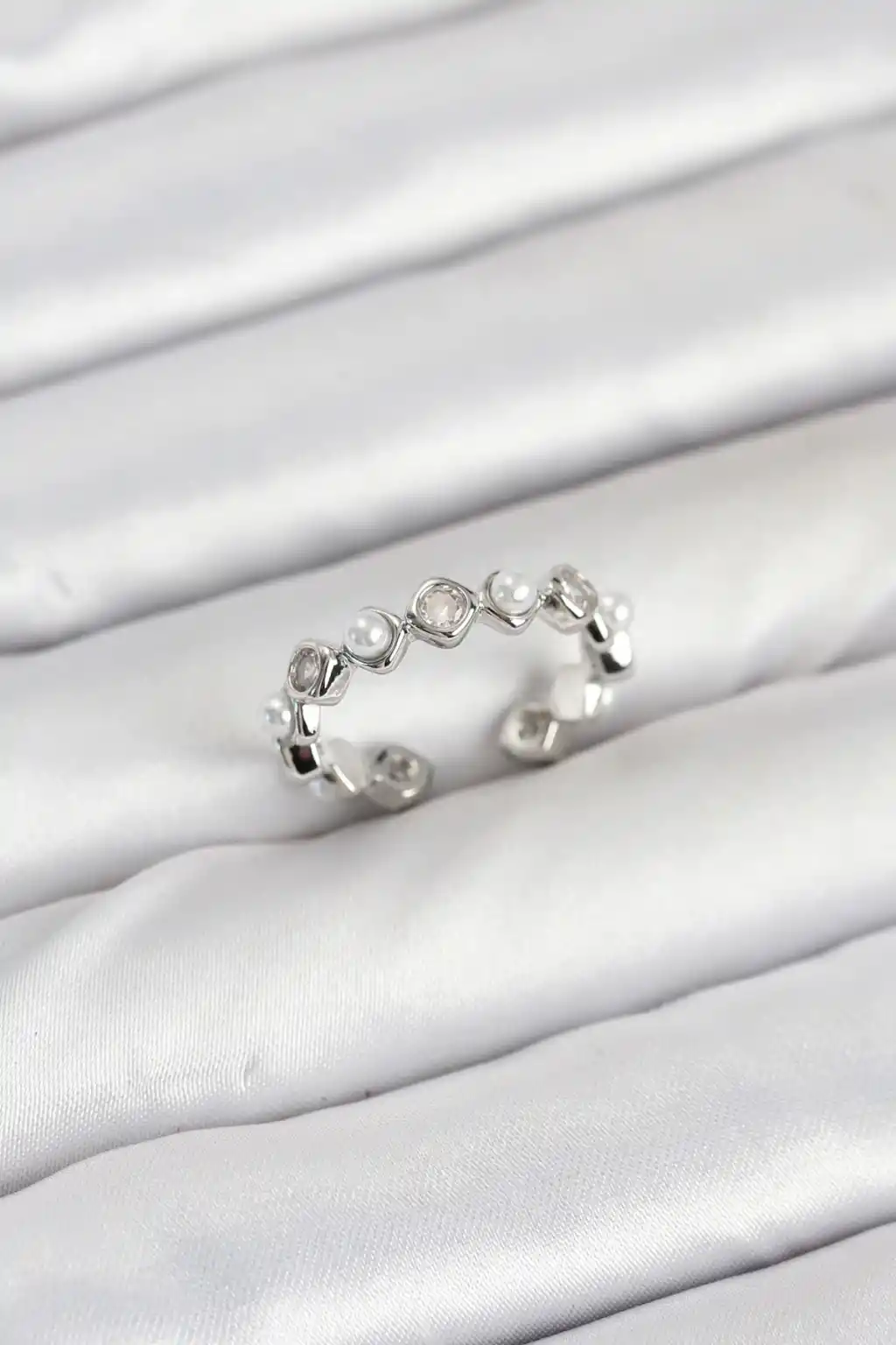Pirinç Gümüş Renk Zirkon Taşlı İncili Kadın Yüzük