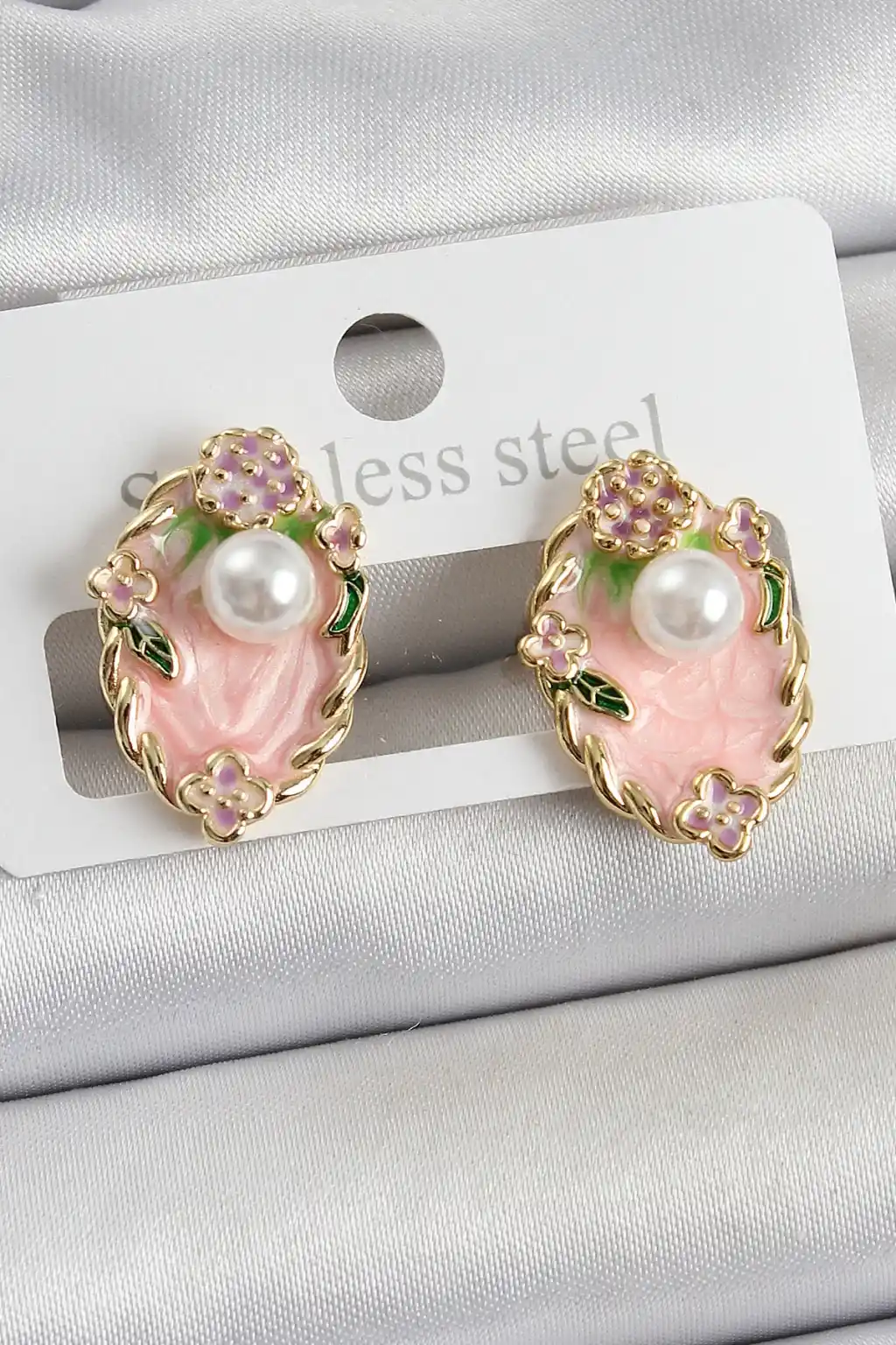 Pirinç Pembe Mineli İnci Detaylı Sanatsal Portre Model Gold Renk Kadın Küpe