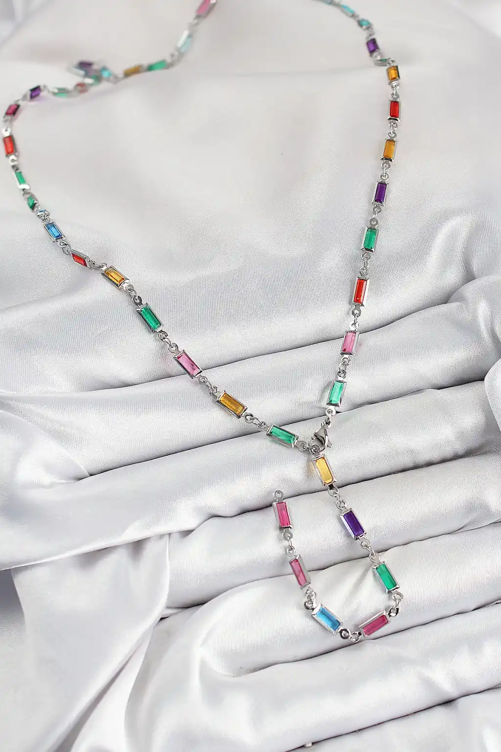 Pirinç Renkli Zirkon Taşlı Dikdörtgen Model Gümüş Renk Kadın Y Kolye