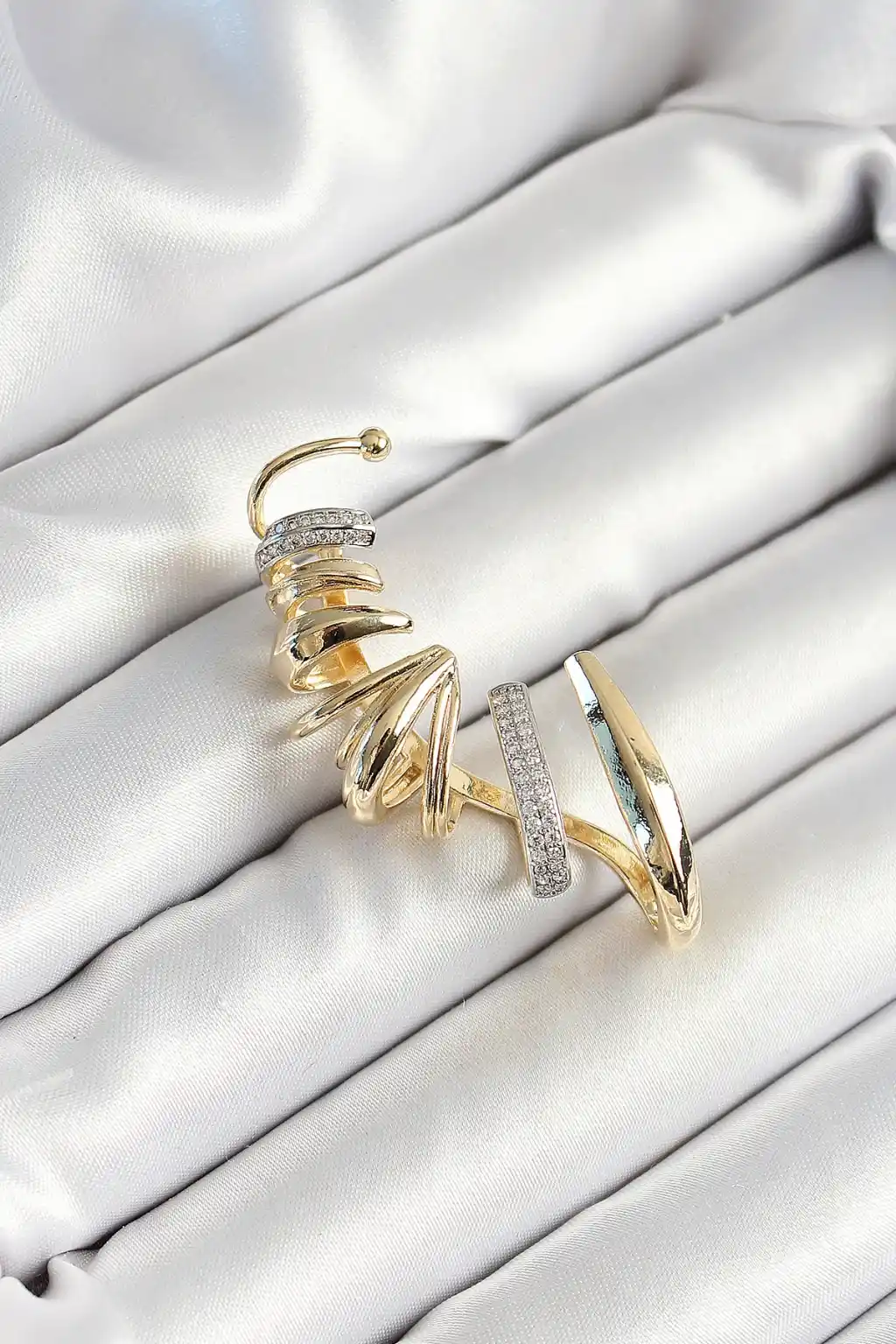 Pirinç Zirkon Taş Kaplamalı Sarmal Figürlü Gold Renk Kadın Sağ Kıkırdak Küpe