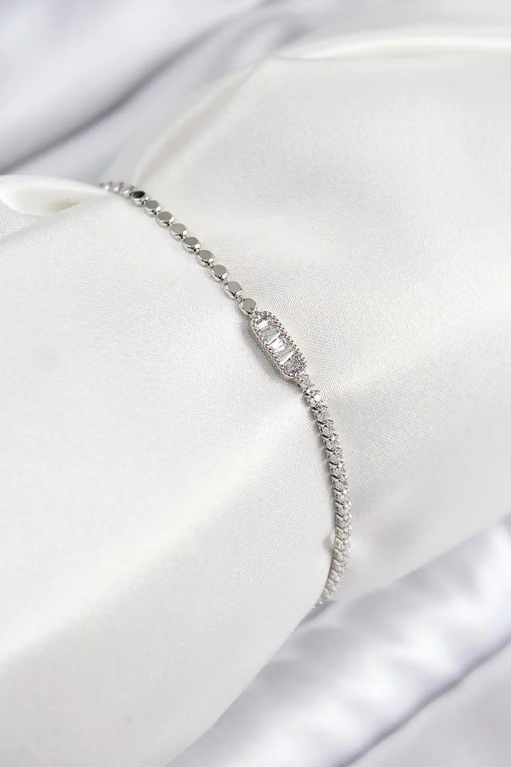 Pirinç Zirkon Taşlı Dikdörtgen Model Ezme Zincir Gümüş Renk Kadın Bileklik