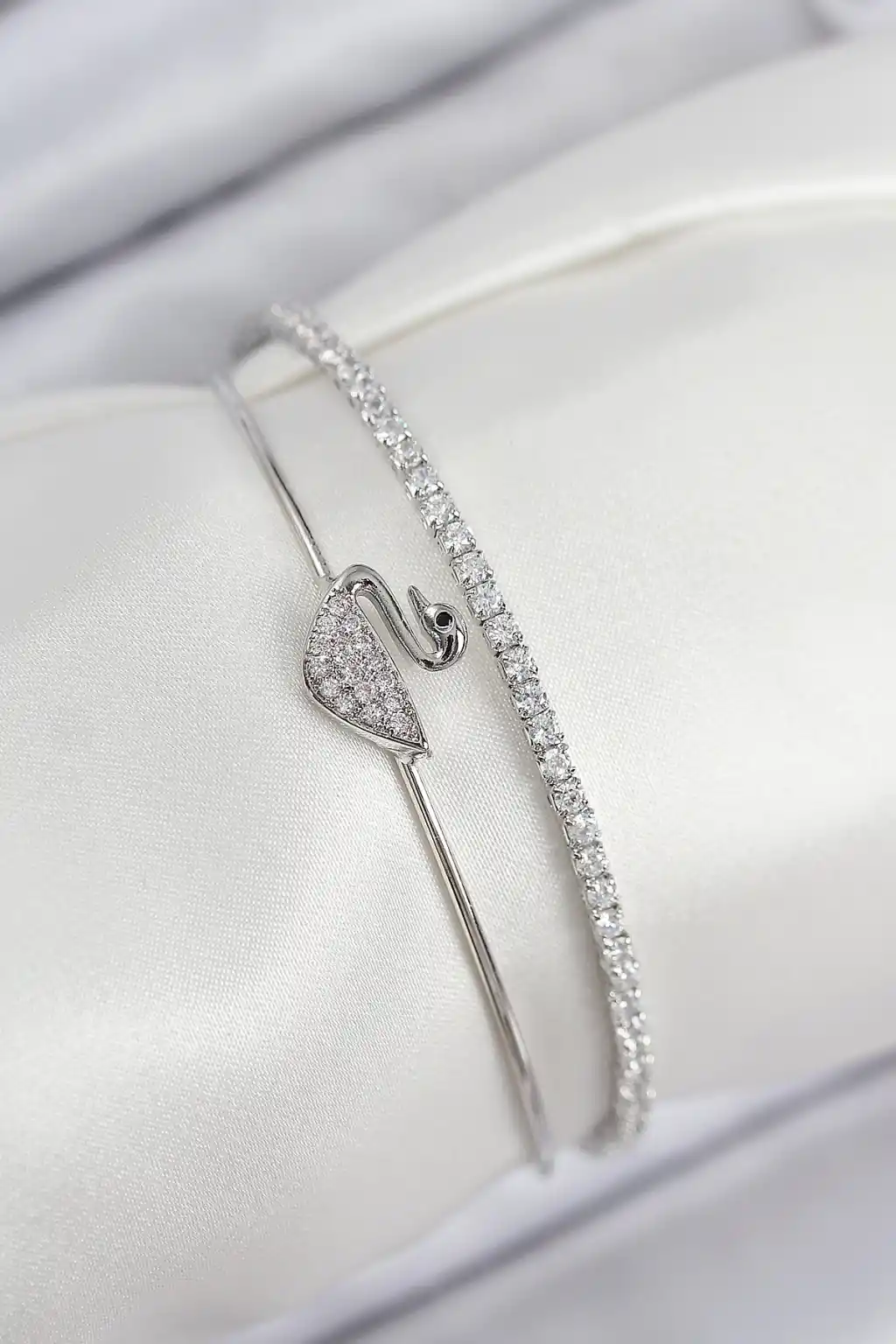 Pirinç Zirkon Taşlı Kuğu Model Gümüş Renk Kadın Bileklik