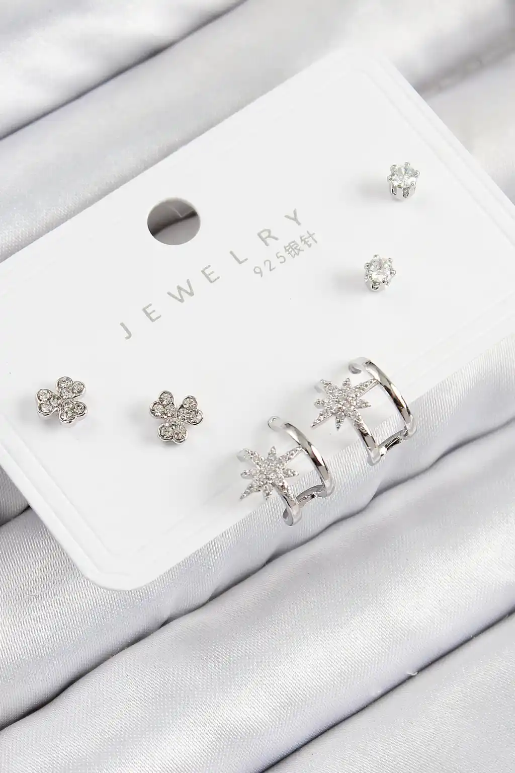 Pirinç Zirkon Taşlı Kutup Yıldızı Model Gümüş Renk 925 Ayar Gümüş Çivi Kadın Küpe Set