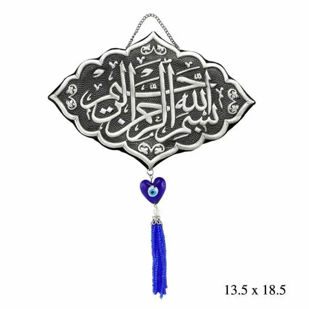 Besmele yazılı nazar boncuklu, püsküllü duvar süsü 925 ayar gümüş ten imal edilmiştir. Evinizin, işyerinizin, ofisinizin duvarlarını bu şık duvar süsüyle renklendirebilirsiniz. Hediye etmek sevdiklerinizi sevindrimek için özel bir seçim. Ürün özel kutusunda gönderilecektir. Ürünlerimizin tamamı el emeği ile üretilmiştir. Gümüş ve değerli taşlar nedeniyle belirtilen ortalama ürün ağırlığında ± %10 sapma olabilmektedir.