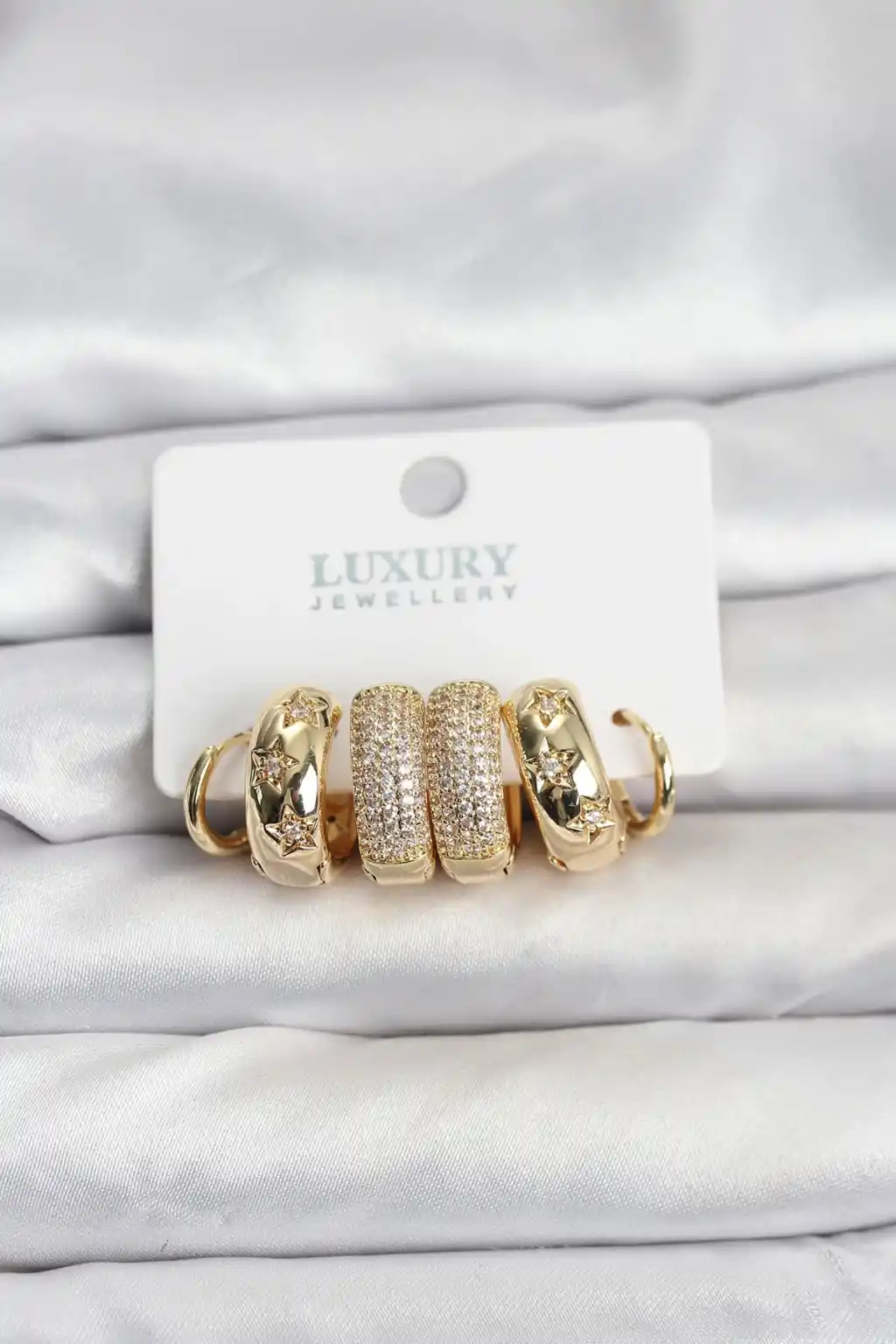 Zirkon Taşlı Pirinç Gold Renk Halka Kadın Küpe Seti