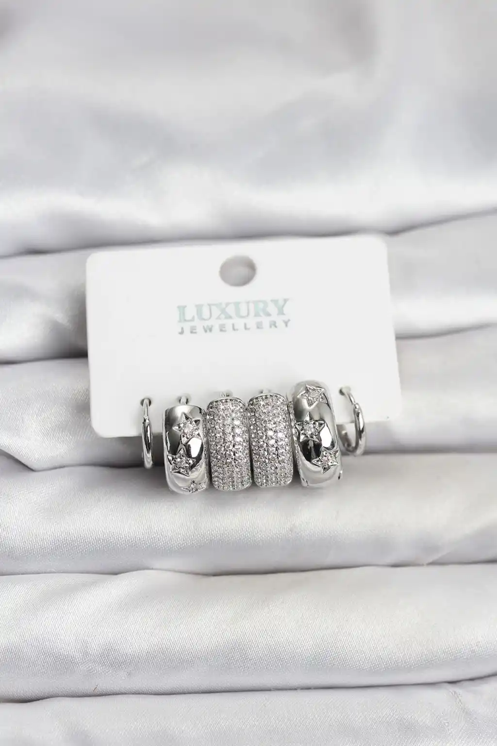 Zirkon Taşlı Pirinç Gümüş Renk Halka Kadın Küpe Seti